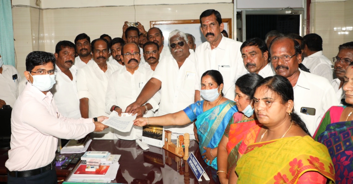 200க்கும் மேற்பட்ட கழகத்தினர், மற்றும் தென்னை விவசாயிகள் சட்டமன்ற உறுப்பினர் அலுவலகத்தில் இருந்து ஊர்வலமாக சென்று சார் ஆட்சியரிடம் கோரிக்கை மனு அளித்தனர்.