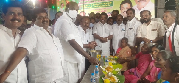 அதனைத்தொடர்ந்து புரட்சித்தலைவர் எம்.ஜி.ஆரின் திருவுருவ சிலைக்கு மாலை அணிவித்து மரியாதை செலுத்தி 500-க்கும் மேற்பட்ட பெண்களுக்கு இலவச சேலைகளை வழங்கினார். அதைத்தொடர்ந்து ஆயிரத்துக்கும் மேற்பட்டோருக்கு அன்னதானம் வழங்கினார்.