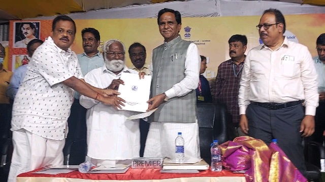 நிகழ்ச்சியில் பங்கேற்ற மத்திய ரயில்வே இணை அமைச்சர் ராவ் சாகேப் பாட்டீல் தன்வேயிடம், முன்னாள் அமைச்சரும், கன்னியாகுமரி தொகுதி சட்டமன்ற உறுப்பினருமான என்.தளவாய்சுந்தரம், நாகர்கோவில் தொகுதி சட்டமன்ற உறுப்பினர் எம்.ஆர்.காந்தி ஆகியோர் இணைந்து வழங்கினர்.