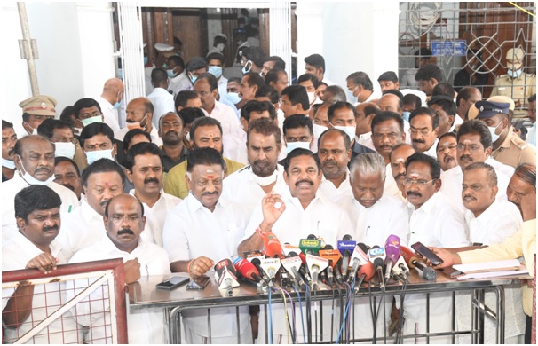 தமிழக சட்டப்பேரவையில் இருந்து நேற்று எதிர்க்கட்சி தலைவர் எடப்பாடி கே.பழனிசாமி தலைமையில் கழக சட்டமன்ற உறுப்பினர்கள் ஒட்டுமொத்தமாக வெளிநடப்பு செய்தனர். இதன் பின்னர் எதிர்க்கட்சி தலைவர் எடப்பாடி கே.பழனிசாமி செய்தியாளர்களுக்கு பேட்டி அளித்தார். அதன் விபரம் வருமாறு:-