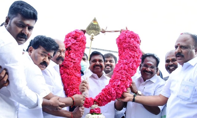 மதுரை புறநகர் கிழக்கு மாவட்ட கழகத்தின் சார்பில் எடப்பாடியாருக்கு ஆளுயர ரோஜா மாலை அணிவித்தும், பூங்கொத்து வழங்கப்பட்டது. எதிரிகளை சம்ஹாரம் செய்யும் வகையில் முருகப்பெருமானின் புனிதமான வேலை எடப்பாடியாருக்கு, கழக அமைப்பு செயலாளரும், மதுரை புறநகர் கிழக்கு மாவட்ட கழக செயலாளருமா வி.வி.ராஜன் செல்லப்பா வழங்கினார். அதனை தொடர்ந்து கழக நிர்வாகிகளும் பூங்கொத்து கொடுத்தும், சால்வை அணிவித்தும் வரவேற்றனர்.